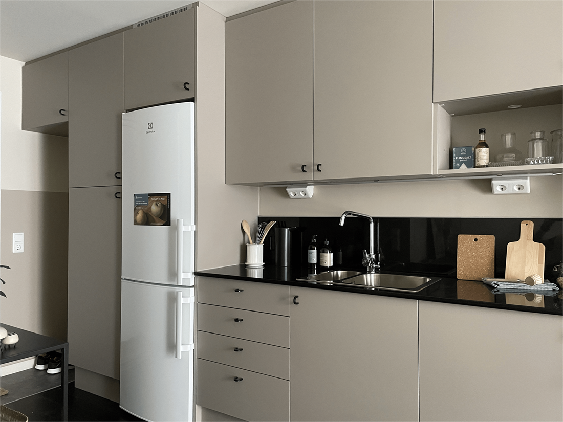 - Kök är utrustade med kombinerad kyl/frys, spis med ugn och diskbänk.