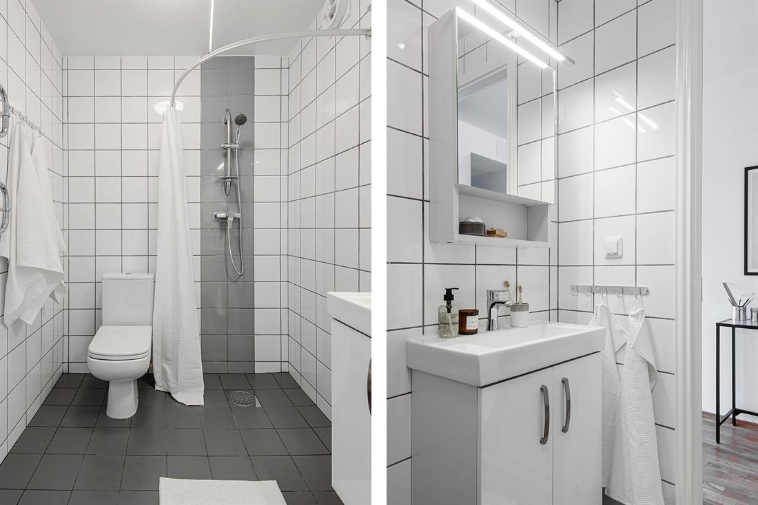 The bathroom includes a sink, under-sink cabinet, shower, and toilet. At Nekvägen 27–29, a washing machine is also available in the bathroom.