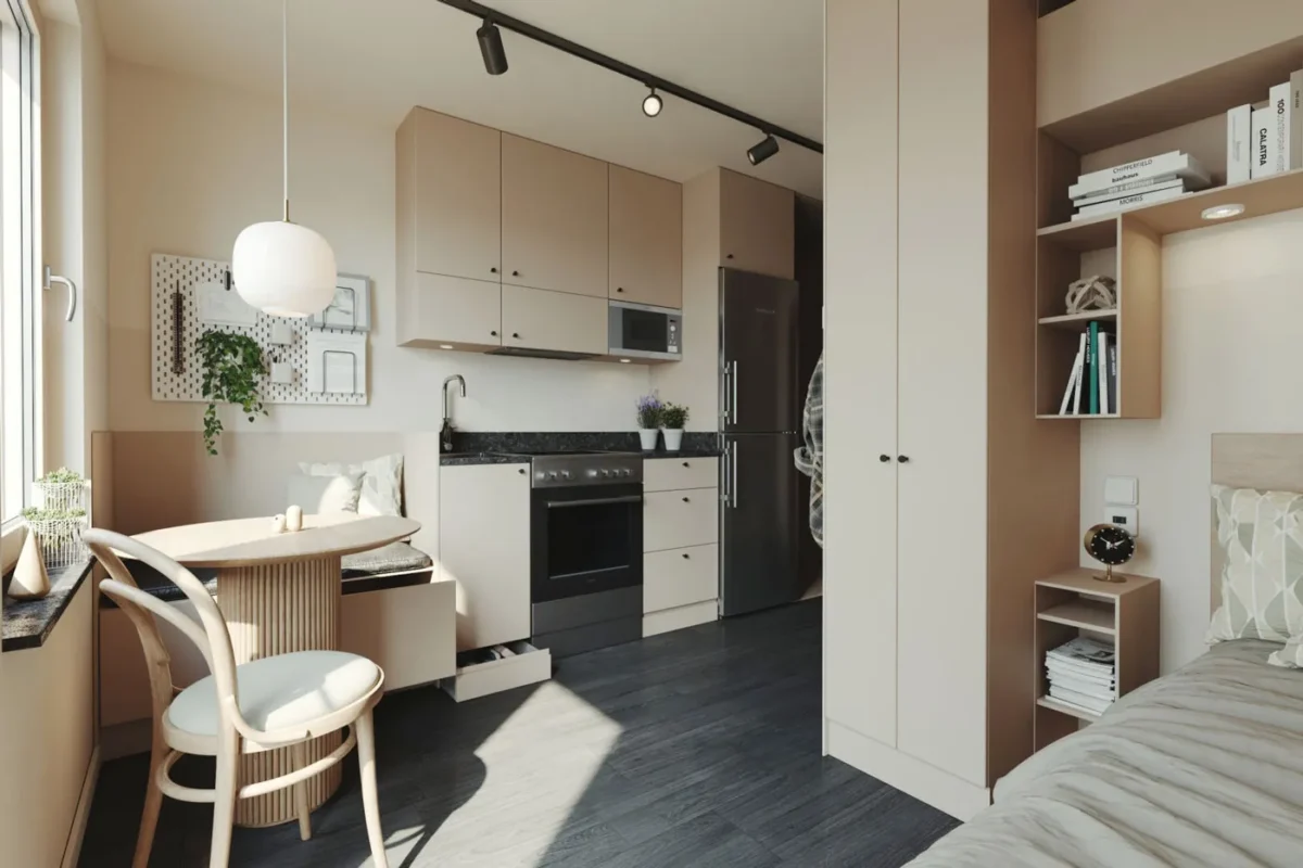 Modern and well-planned student apartments with bright and sustainable design, close to green areas and excellent transport links to Stockholm city.