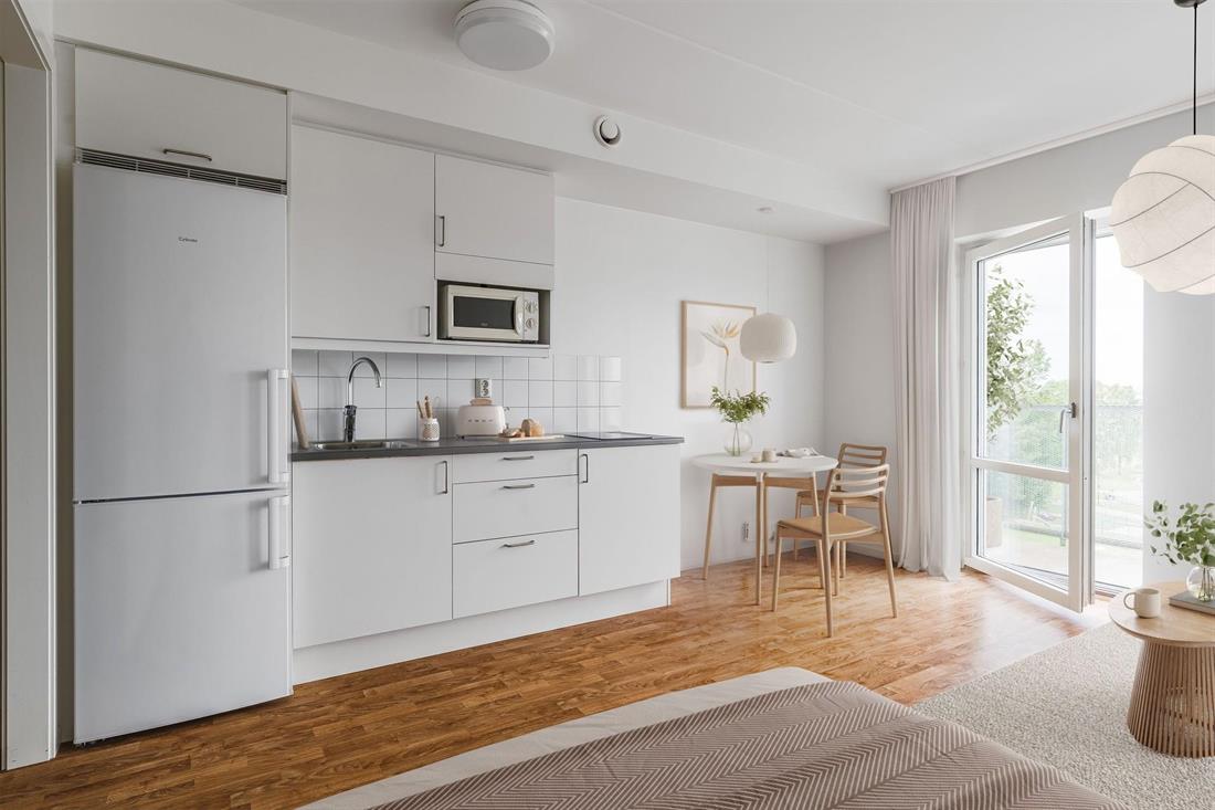 På Campus Kryddan erbjuder vi ljusa bostäder på 1 Rok om 25 kvm med eget kök och badrum.