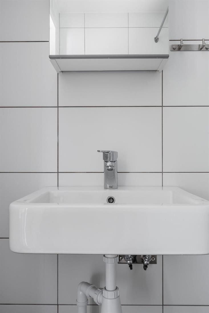 Badrum är utrustade med handfat, spegelskåp, dusch och toalett.